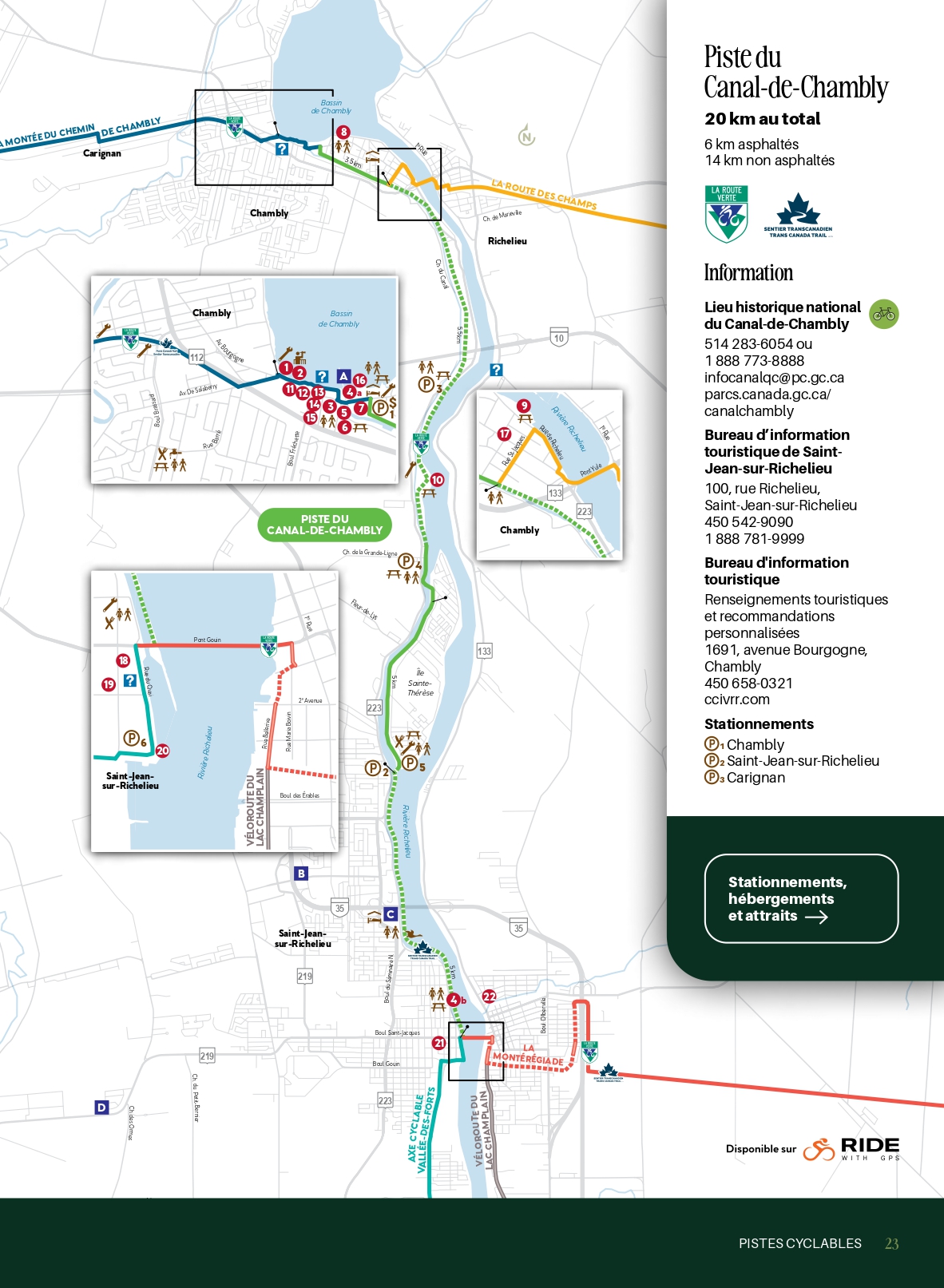 Durant le parcours, des arrêts vous permettent de profiter d’espaces verts, de découvrir le patrimoine régional ou d’effectuer une pause gourmande. À la fin de la journée, prenez le temps de vous balader dans le centre-ville de Chambly ou le Vieux-Saint-Jean et découvrez leurs charmants commerces. D’ailleurs, Saint-Jean-sur-Richelieu sert d’excellent camp de base pour un séjour à vélo, avec deux hôtels, dont un Bienvenue cyclistes !, un hébergement flottant installé au bord de la rivière Richelieu, ainsi qu’un camping.