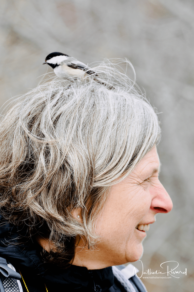 - Lors de mon séjour, une mésange à tête noire s’est posée sur la tête de l’amie qui est venue me rejoindre pour la journée. Elle cherchait du matériel pour son futur nid. Les cheveux gris ont retenu son attention.