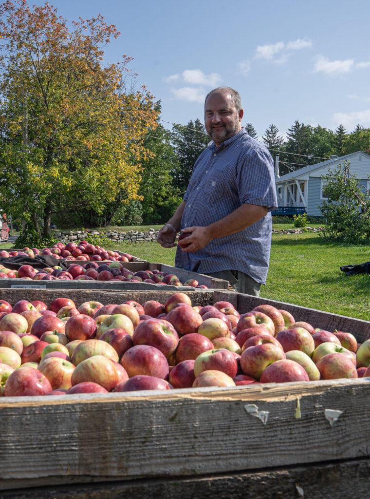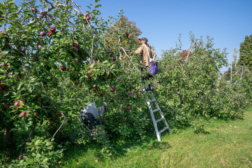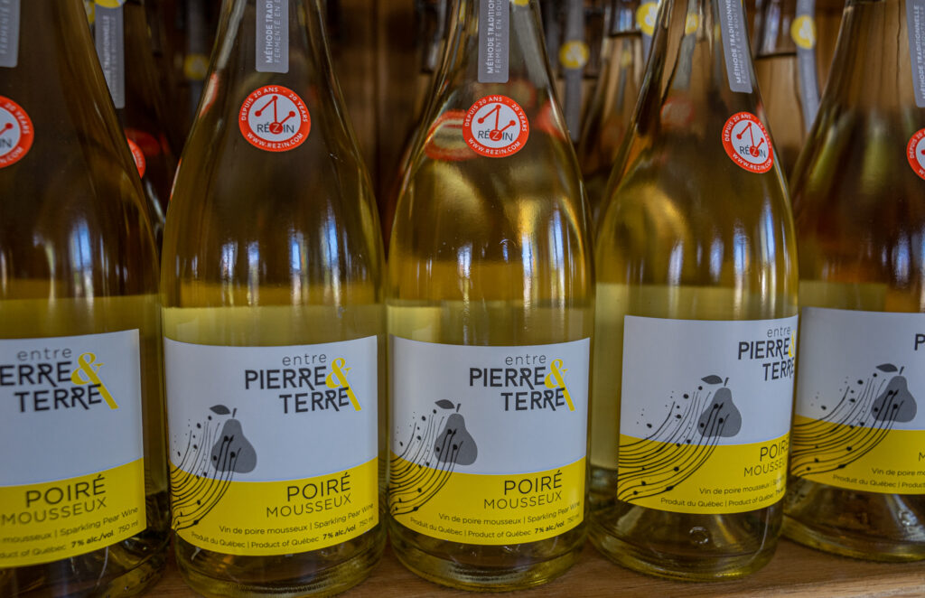 À Entre Pierre & Terre, on ne fait pas d’autocueillette, mais nous croisons tout de même des cueilleurs venus prêter main-forte aux propriétaires pour effectuer la récolte de pommes, de poires et de petits kiwis rustiques destinés à la confection des produits. C’est Loïc Chanut, copropriétaire de ce domaine enchanteur avec sa conjointe Michelle Boyer, qui nous accueille et nous guide à travers les vergers. Français d’origine et œnologue comme son père, il connaît la terre depuis sa plus tendre enfance. Il a travaillé avec son paternel dans les vignes, puis pour d’autres viticulteurs et cidriculteurs avec lesquels il a notamment inventé le poiré de glace.