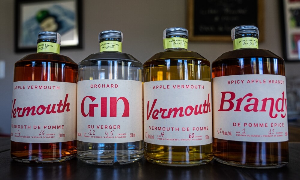« Nous sommes partis du principe que pour faire de l’alcool, il fallait aller aux sources et produire nos propres fruits », raconte Loïc. L’œnologue a décidé de se concentrer principalement sur la production et la fermentation de pommes et de poires. Toutefois, ces fruits assez communs en apparence ont revêtu à Entre Pierre & Terre des noms et des atours tout à fait particuliers. « J’ai donné à une pépiniériste le mandat de trouver des variétés ancestrales spécifiques, explique le propriétaire. Plusieurs d’entre elles sont rares, voire introuvables ailleurs. On a en même une conçue pour que le fruit soit ramassé surmûri une fois tombé sur le sol, c’est merveilleux ! Ce qui m’intéresse, ce sont les fruits de fin de saison, trop acides ou tout simplement mauvais à la consommation. »