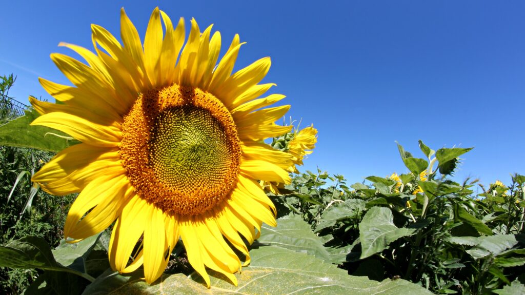 Pendant la floraison des tournesols, un arrêt à la Ferme Améroquois s’impose pour observer le spectacle des champs illuminés de jaune.