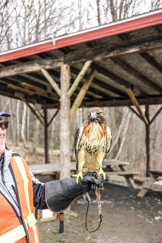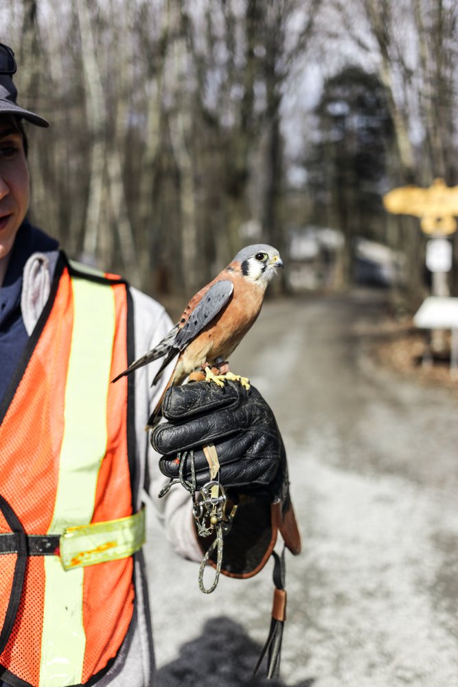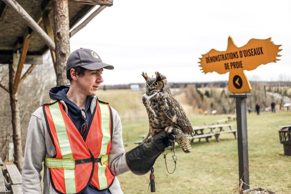Ensuite, on peut visiter les oiseaux résidents qui vivent dans de grandes volières sur le site. Ce sont des animaux qui, pour diverses raisons, ne pourront jamais retourner dans leur habitat naturel. Ce sont plus de 11 espèces qu’on peut observer, comme un harfang des neiges, ou un aigle à tête blanche. Finalement, on peut observer de plus près des oiseaux ambassadeurs qui ont l’habitude d’être manipulés.