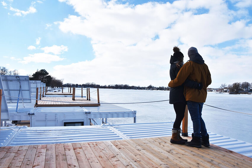 Flotel is THE destination to surprise your sweetie with an unexpected staycation! Located on the bay of lac Saint-François, this floating hotel features six rooms on three platforms made from recycled 40-foot shipping containers. Flotel is powered by solar electricity—it’s entirely off the grid and sustainable. Each room has everything you need for a comfortable stay. We love that each room has two patios with views of the bay—one on the roof and the other just off the room with a small fireplace. Just dress warmly and you’re all ready to snuggle next to the fire.