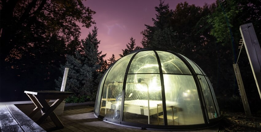 Did you know there’s a place to spend the night just 35 minutes away from Montreal that will make you feel like you’ve travelled to Bora-Bora? That place is Domaine Pourki in Sainte-Anne-de-Sabrevois. Indeed, among the various accommodations on the site, you can settle in one of the Bora-Bora-type huts. Recognizable by their typical French Polynesian architecture and accessible by a long wooden dock, these charming structures will immediately transport you to a heavenly tropical region. Even more unusual, you can treat yourself to a night in the Fa-bulle-euse, an inflatable bubble that can accommodate up to four people. That’s the kind of experience that will take your breath away!