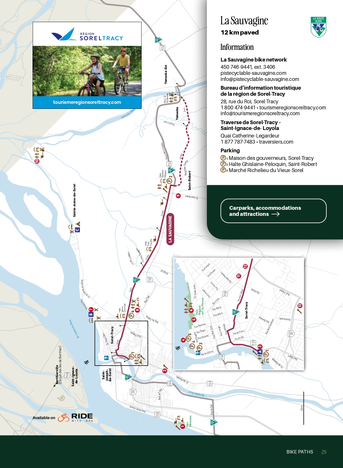 La Sauvagine bike path, 12 km long and fully paved, connects Sorel-Tracy to Saint-Robert through fields, wooded areas, and farmland. Easily accessible via the Route verte, it also offers the option to continue toward Lanaudière region via the Sorel-Tracy–Saint-Ignace-de-Loyola ferry.