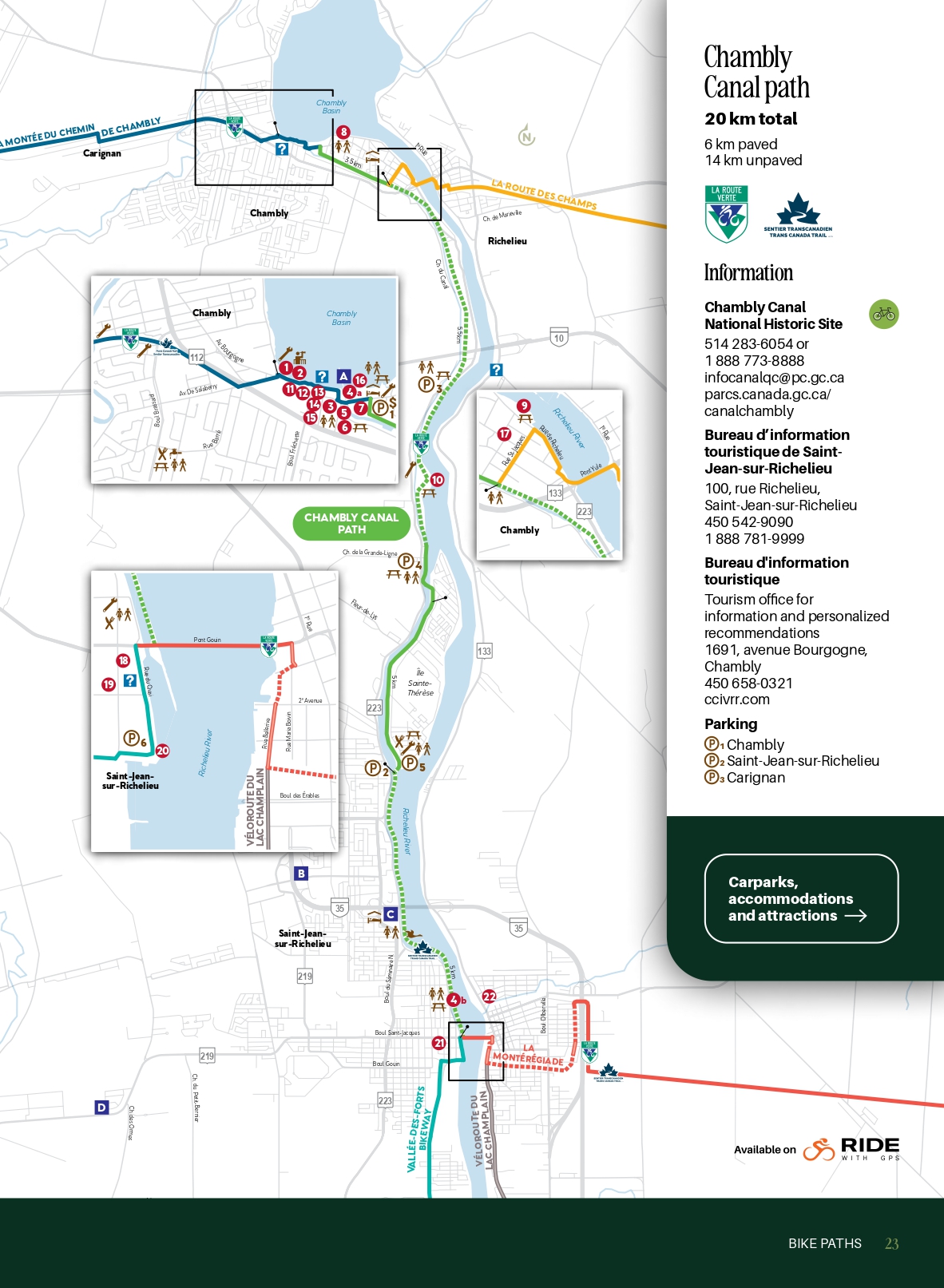 There are stops along the way for enjoying the green spaces, learning about the legacy of New France or indulging in good food. Downtown Chambly or Old Saint-Jean and their charming shops are a great way