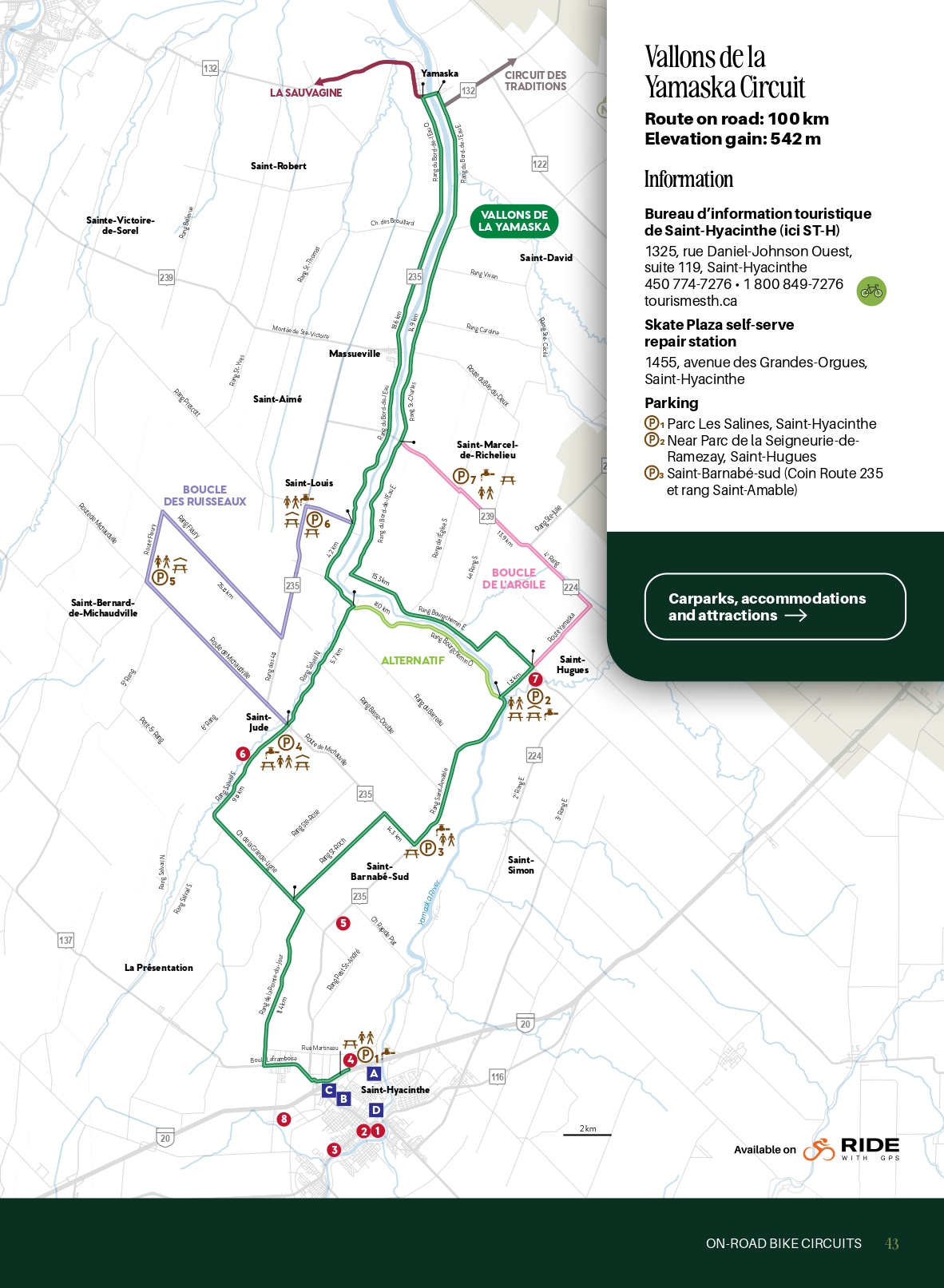 This 100 km on-road circuit borders the Yamaska river and run through rural-scapes typical of the Maskoutains region.