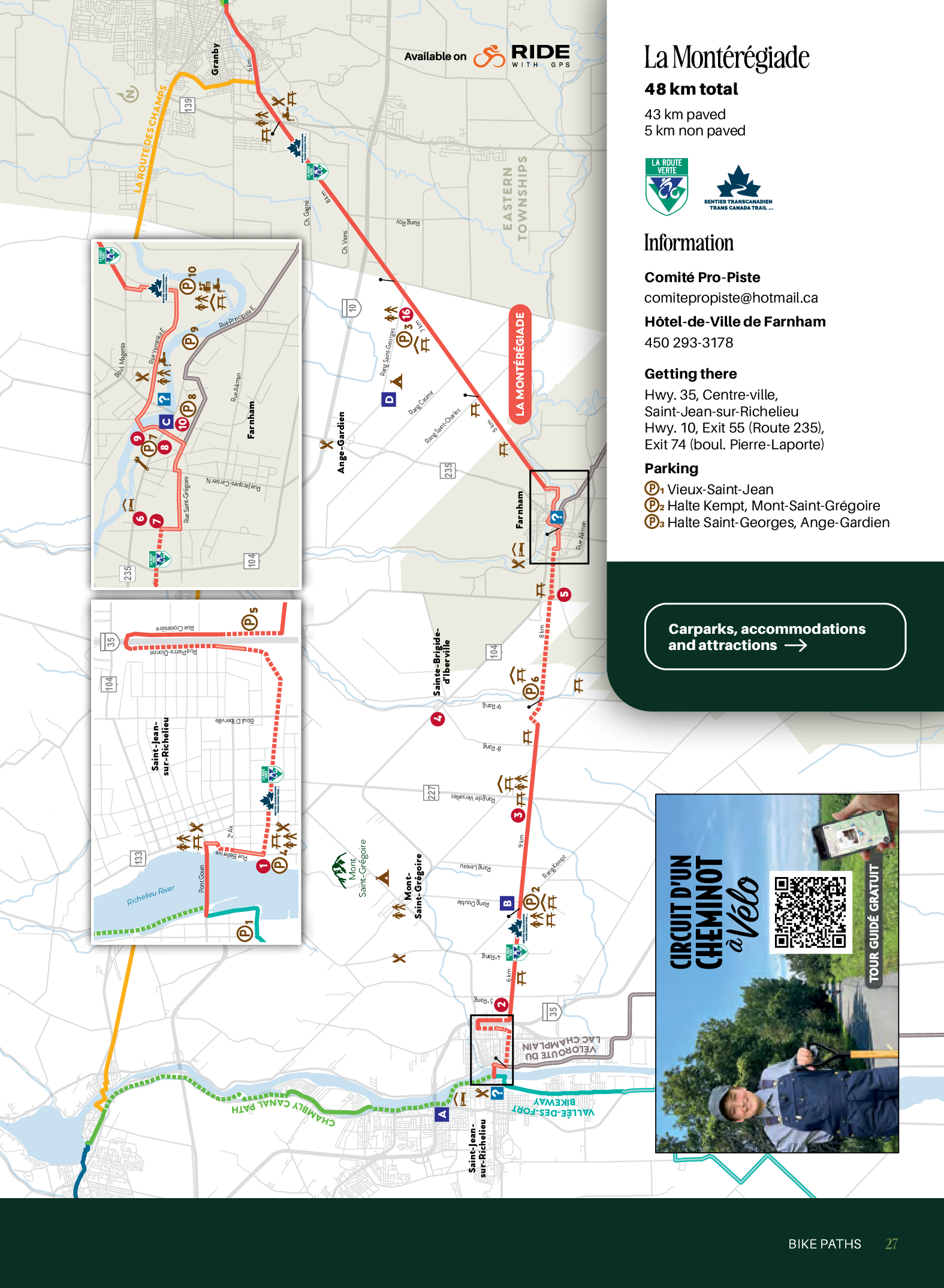 Spanning 48 km, 43 km of which paved, La Montérégiade connects Saint-Jean-sur-Richelieu and Granby along farmland and woodland. Possibly stopping for cows crossing the road is among the many pleasant surprises in store for you.