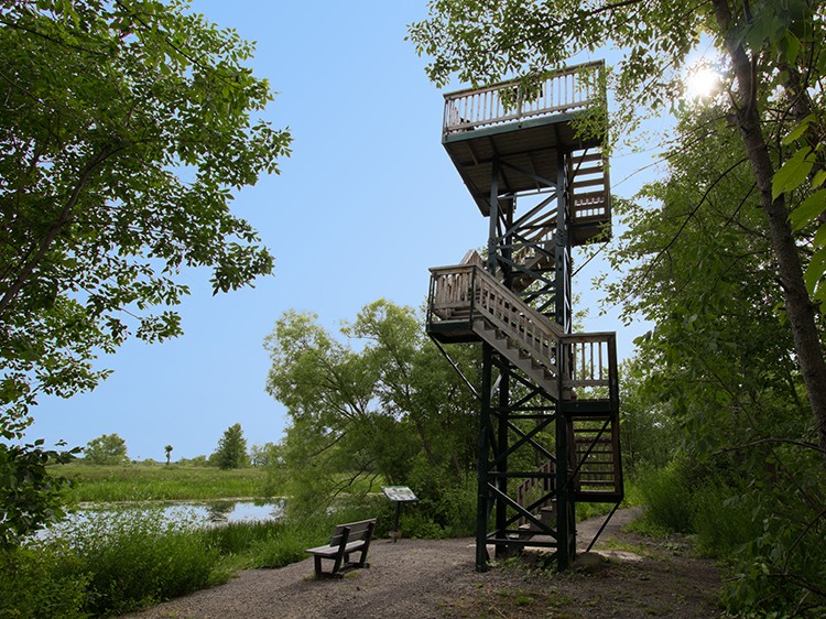 Le sentier linéaire de la baie d'une longueur de 1,3 Km avec sa tour et ses haltes, vous amène au coeur même du plus grand marais aménagé de l'est de l'Amérique du Nord.
