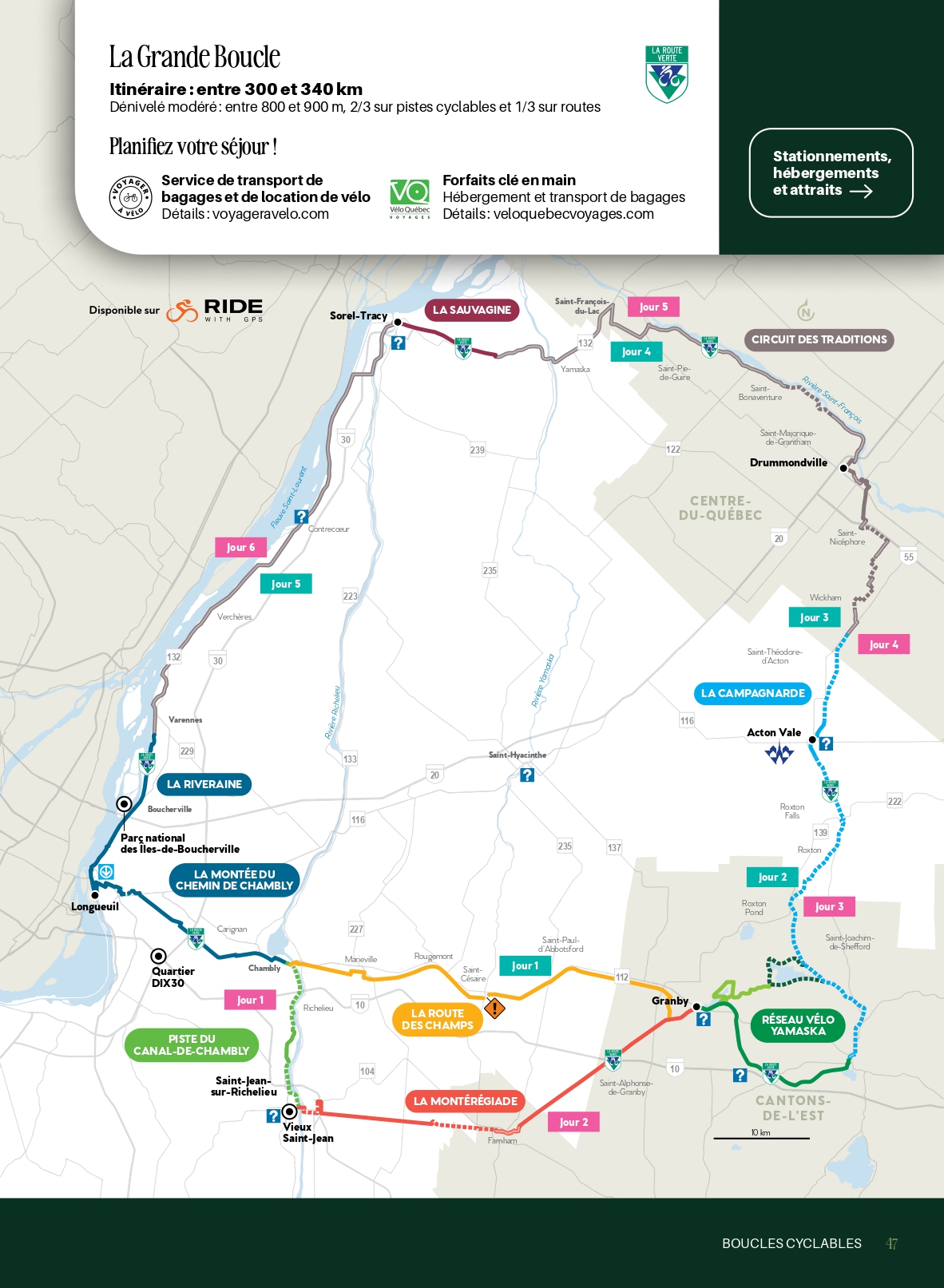 Adapté aux aventuriers, ce circuit se complète en 5 à 6 jours selon la distance que vous souhaitez parcourir quotidiennement. Pour un confort optimal, optez pour les services de Voyager à vélo, qui transportera vos bagages d’un point à l’autre. Planifiez vos pauses, car certains attraits ne sont pas toujours signalés en bordure de piste.