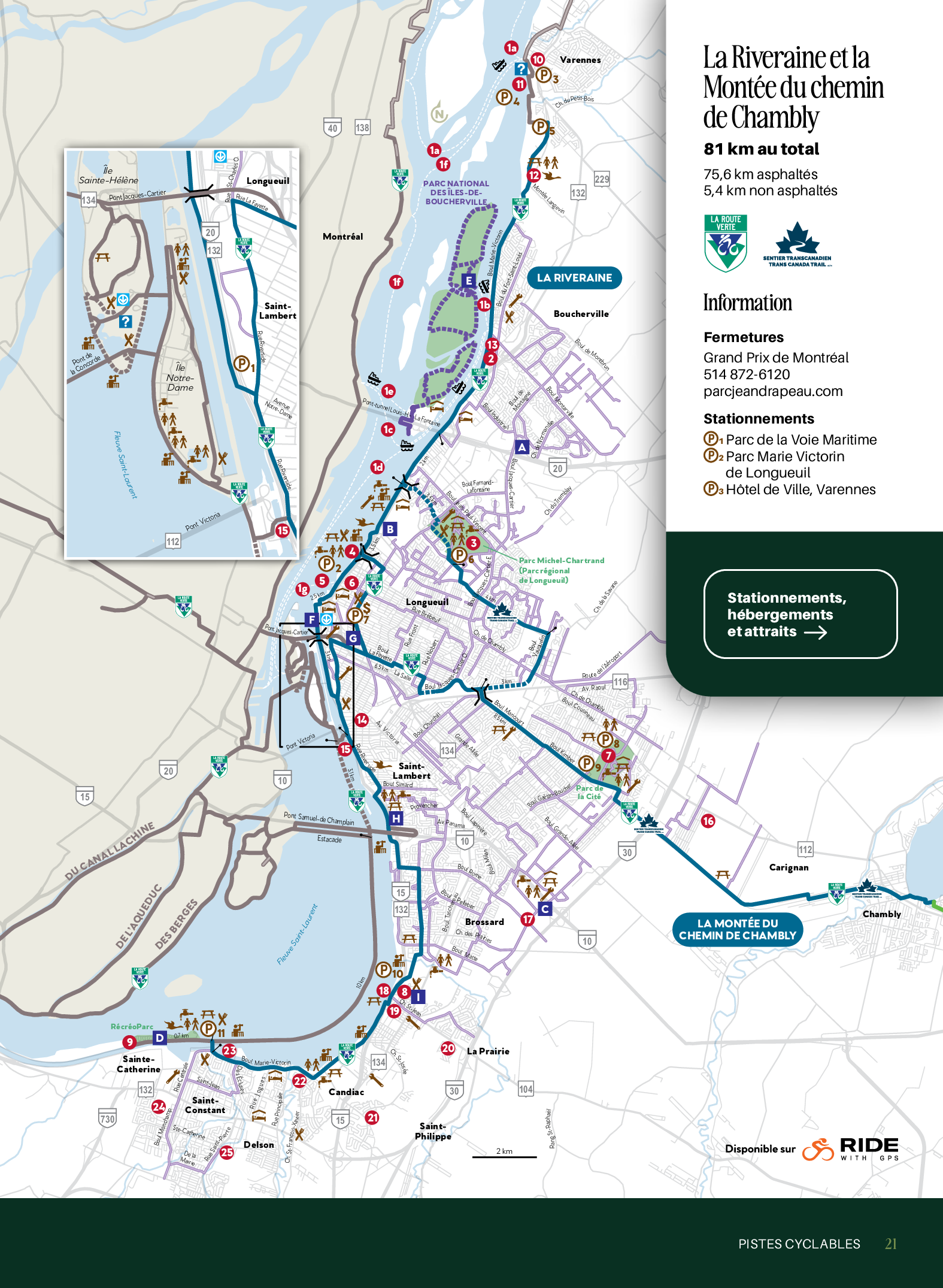 En longeant le fleuve Saint-Laurent de Saint-Constant jusqu’à Varennes, La Riveraine permet de parcourir un environnement à la fois urbain et naturel, ponctué de parcs riverains, de points de vue sur Montréal et de lieux culturels et patrimoniaux, qui méritent tous un arrêt.