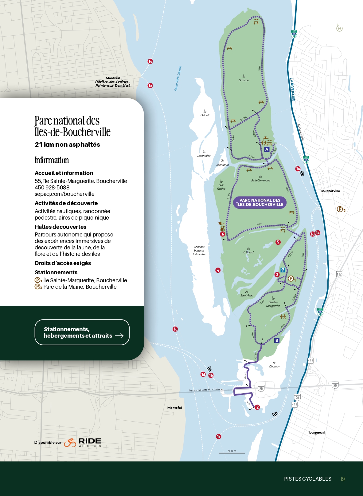 À quelques minutes de la métropole, ce parc insulaire, membre de la Sépaq, propose plus de 20 km de pistes cyclables au cœur de marais, de cours d’eau et de boisés, dans un environnement préservé où les cerfs abondent.
